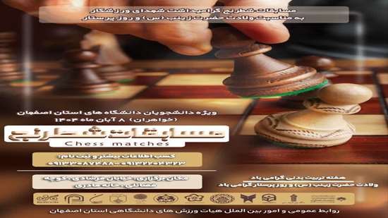 ����به مناسبت ولادت حضرت زینب (س) و روز پرستار، مسابقات شطرنج گرامیداشت شهدای ورزشکار ویژه دانشجویان دختر دانشگاههای استان اصفهان برگزار میشود.